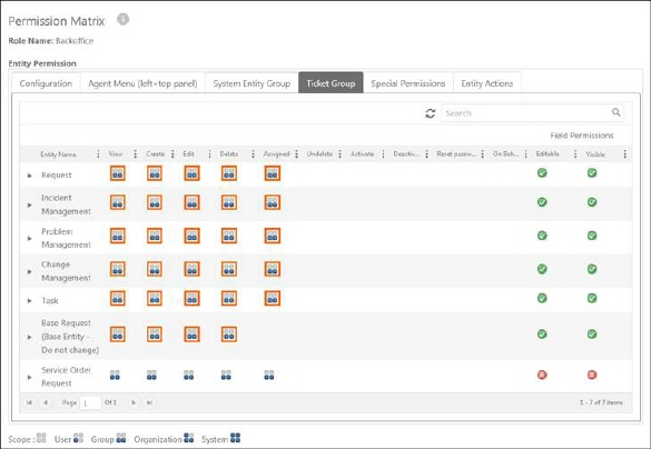 The Permission Matrix contains different tabs for active entity groups which are used to define role permissions access. Along with these tabs, there are two additional tabs: System Menu and Special Permissions which are used to define permission for system and configuration menu and define special function permissions for entity data, forms and views respectively. All these sections are described in following sections.