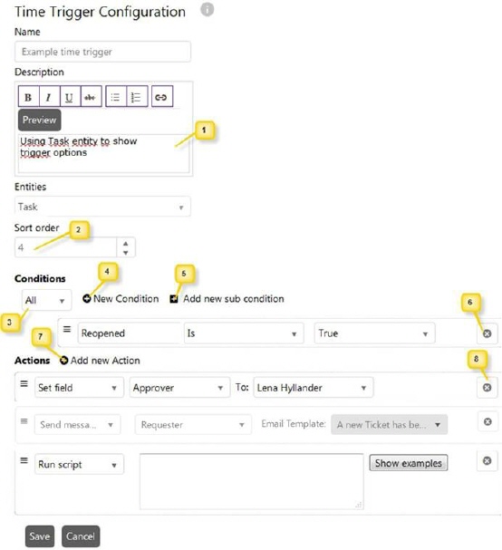 Now, fill out the details in the form. These details contain Name, Description, Sort Order Conditions and Trigger Actions. Click Save button to save the trigger.