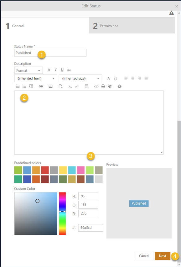 4. Cancel / Next - abort the creating the status or take one to the Permission tab.