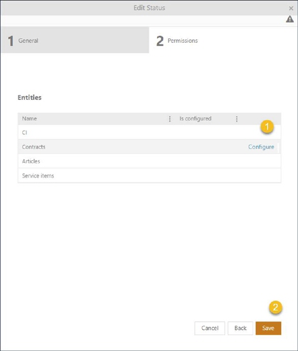 1. Entities - select the entity ( CI, Contracts , Articles , Service Items) that will have the status available for flagging.