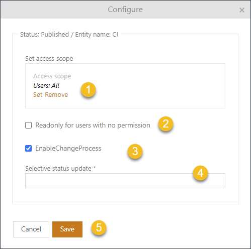 In the last step you are prompted to select and define the access scope for the edited status. The process is similar for CI Members tab, but only affects statuses.
