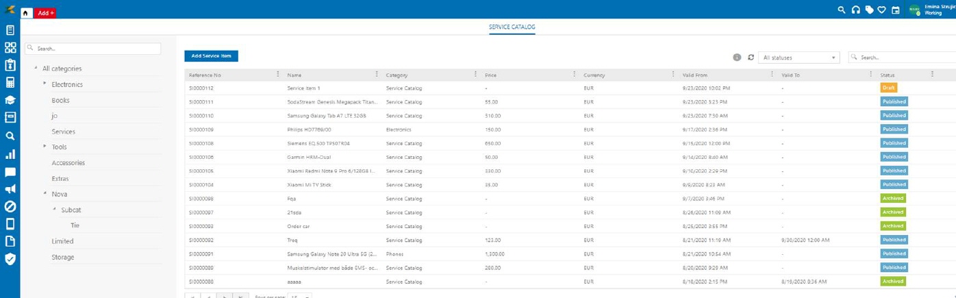 This page contains a list of all existing Service Catalog Items (SCI). From here you can add new SCI, edit or delete existing one and change SCI Status.