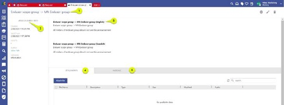 •Right panel (3): Shows announcement content in each language it is created, Attachment tab (4) and Audience tab (5). Within the section Audience you can set permissions who has access for selected announcement.