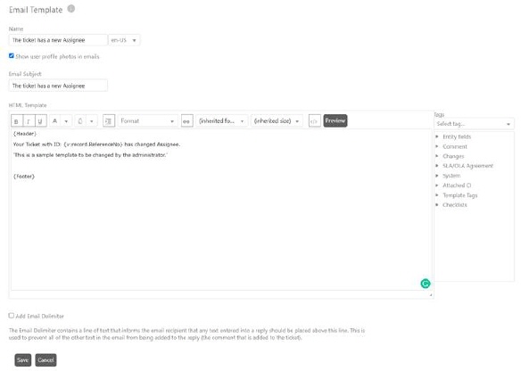 The following figure shows the Email Template form. This form contains the basic fields that are necessary to create the template like Name, HTML Template and Email Delimiter.