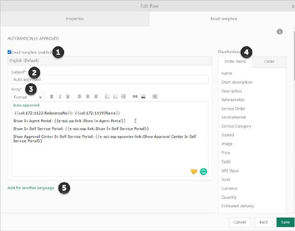 3.  Body: This box is used to define the email body text in HTML format. Use placeholders (4) to add information from current Service Order Item.