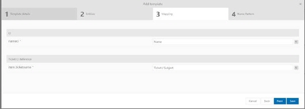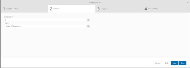 In second tab choose root and child entity type for template. Use browse button to choose entity you want to export. Use browse button to choose entity you want to export. Available entities are: Base Request, Change Management, CI, Contracts, Cost centers, Custom entities, Customer Accounts, Incident Management, Invoice details, Invoices, Knowledge Base, Leased CI, Problem Management, Request, Service Catalog, Service Order Request, Worklog. Required field.