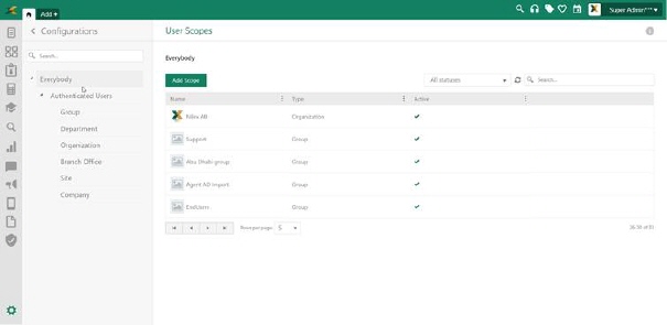 On the right side is table with a list of Permission Scopes. The list could be filtered based on selected Permission Scope Type in left part, filter for All/Active/Inactive or performed search.