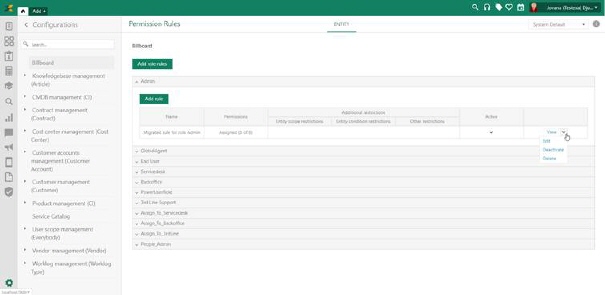 In the right part, Permission Rules for the selected entity are shown grouped by Role. If your NSP system is upgraded from earlier version you find here for System default schema, all rules that have been migrated for existing roles from old entity action permissions.