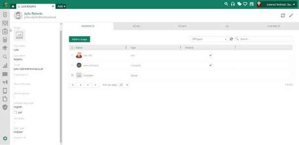 User Form is a detailed view of a user. It contains all user properties, and tabs Member of, Roles, Tickets, CIs, and Contracts showing items connected to selected user. This view is also used to edit the User.