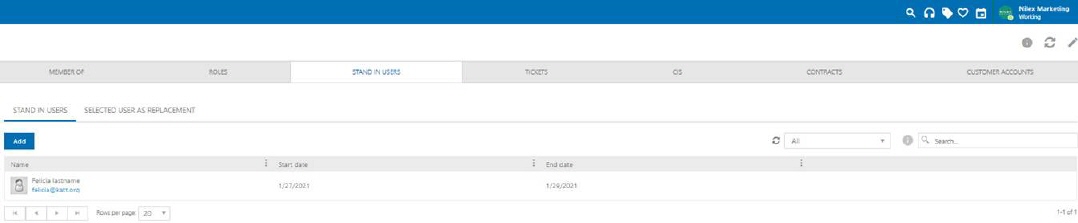 The second view- Selected user as replacement, shows a list of all users who have selected me as their stand-in user. This list is read-only mode.