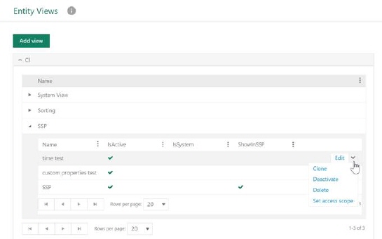 Form consists of a list of defined views, grouped by View category, showing Name and flag for Active, System and Show on SSP. In action menu on each row you can select: