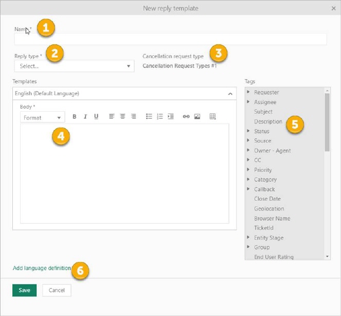 New Cancellation Request Reply template can be added by clicking the Add reply template button.