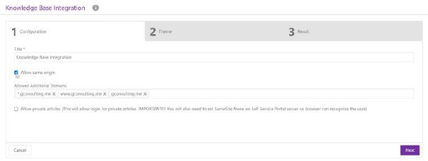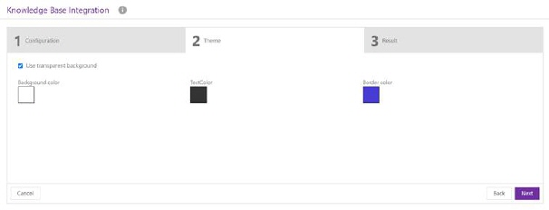 Use NEXT button or click on THEME to proceed the next tab. Use CANCEL if you want to cancel configuration of KB integration