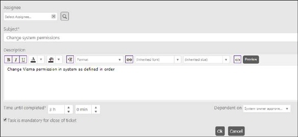Assignee: Default assignee for the task. Could be a specific Agent or a Group. If defined, the task will be automatically pre-set assigned to this Agent or Group when task is added to a ticket. If Assignee is left empty you can define user when tasks are added. Auto-complete field, start typing and you will get suggestions, or click the  button to open a popup where you can select Assignee.