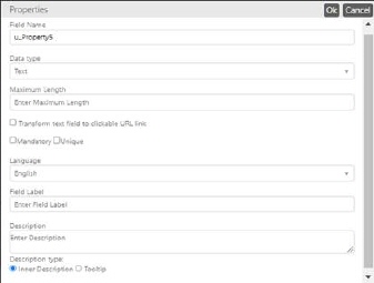 o Maximum Length: This field is displayed below Data Type dropdown list if you select Text or Multilanguage Text in the dropdown list. You define the maximum number of characters allowed for that field.