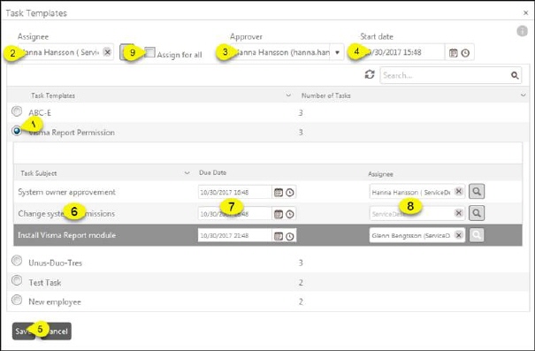 2. Select Assignee or Group in the dropdown (2). Field is initiated with Group the master ticket assignee is a member of. All tasks in the list that have no pre-defined assignee will get this user/group as assignee. If you enable the checkbox Assig for all the Assignee fields for all individual tasks in the template (8) are updated with the selection. After selection you can make changes for each task in the list individually.