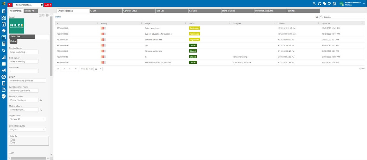 The right part contains four tabs with data associated to the User or Organization based on selected tab in the left part; Linked Tickets, CI List, Contract List, Task List, Call Log, Stand-in users, Customer Accounts and Settings (Settings is only available if User tab is selected in the left part). In all the lists you find functionality for search, filtering, sort, export and page handling. These are described in General User Interface.