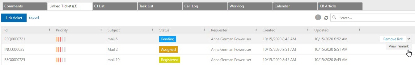 Linked Tickets tab contains a list of tickets linked to current ticket. Each item in this list includes Id, Priority, Subject, Status, Requester, Created date, Updated date and Actions containing View remark and Remove link buttons.