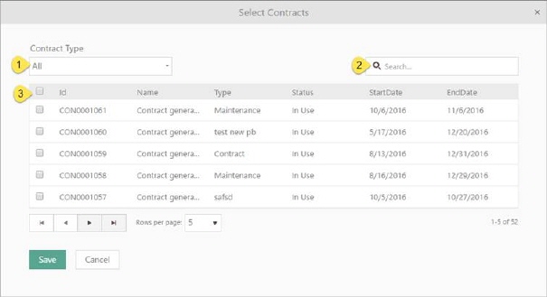Contract can be searched by name (2) and/or be filtered by Contract Type (1). After choosing Contract Type table is filtered due to selected type.