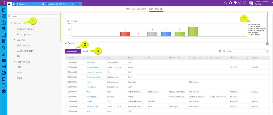 Panel on the left side (1) is used for selecting Contract types. After choosing contract type table is filtered due to selected type. Button for adding New Contract (2), is also changing due selected type. Adding new Contract functionality is explained in detail in Adding new Contract.
