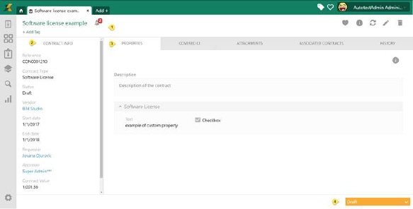 •Left panel: Contains general Contract properties (2), properties that are common for all Contract types, see below.