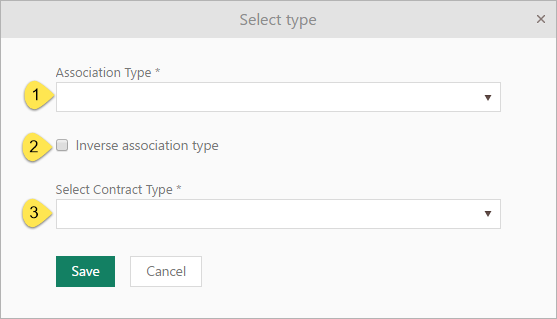 In the opened form you define association details, first you have to choose Association Type (1),required, which is dropdown field, and you can choose one of the Association Types defined in Contract Management (e g Renews – Renewed by).