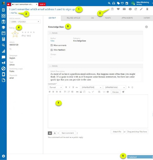 Article Form is a detailed view of an Article. It will contain all properties, comments, associations with other articles, tickets and configuration items, attachments, changes history (lifecycle tracking) and audit history. This view is also used to edit an Article.