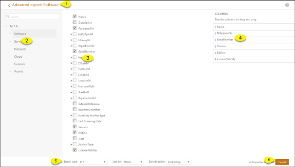 Note: Selection of CI Type in left panel (2) will not change which type of CIs to include in export. This selection only change which properties you can select. Which CI Type to be exported is already chosen in CI List and is displayed in Advance export Header (1).