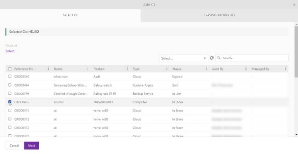Search and mark one or more CI in the list, then click Next to go to tab Leasing Properties.