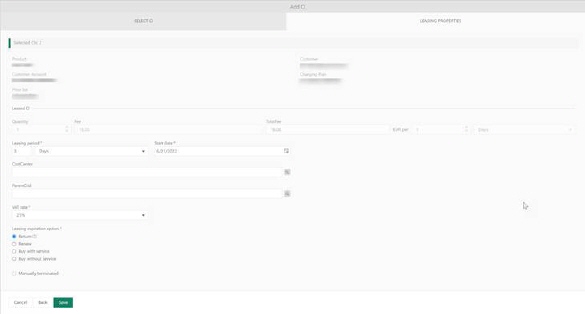 It is possible to add multiple leasing in the same session, and depending of Product towhich included Cis belong Leasing Properties tab is slightly different.