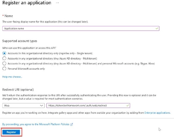 Redirect URI (optional): Choose WEB in dropdown and type the following URL: https://token.botframework.com/.auth/web/redirect