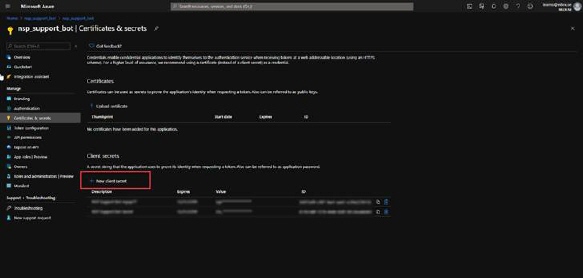 Bot Channel Registration – Certificates & secret – New client secret