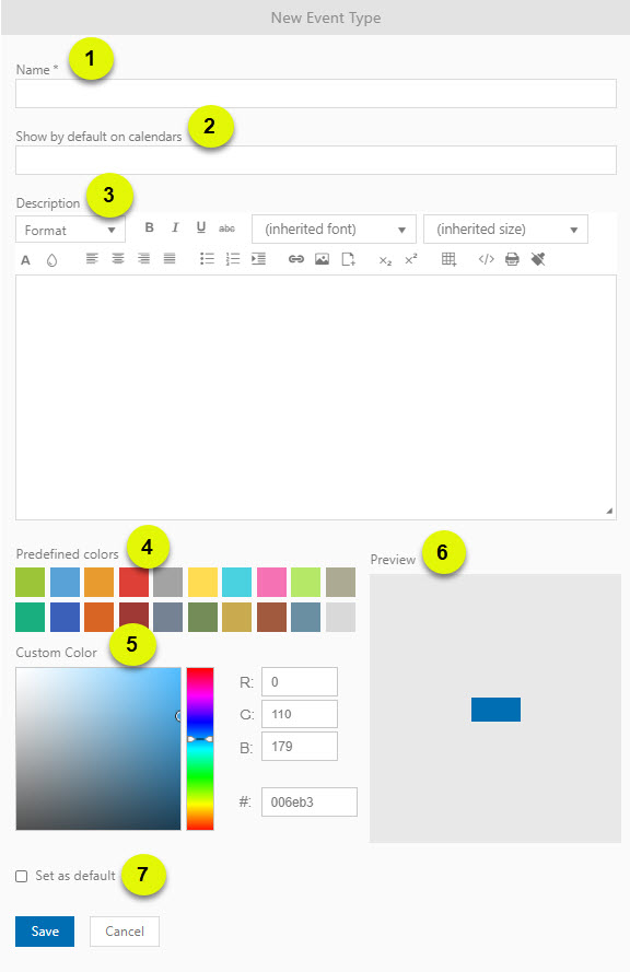 7. Set as default: Select this checkbox if you want to mark event type as default.