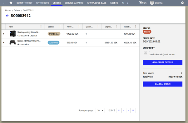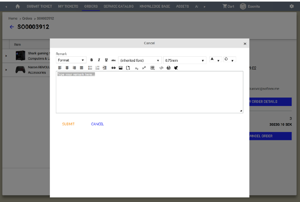 Important note: Canceling affects the entire order and all order items. If users decide to cancel the order, they will be asked to leave a comment/remark.