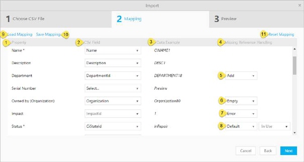 Mapping step also offers possibility of saving custom mapping for selected CI type, set default mapping and Load preferred mapping from list of saved mappings.