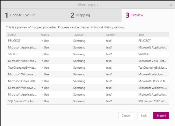 After the mapping is determined, preliminary import into the temporary staging table will be performed. That table will be shown in Preview tab of the import wizard where you can visually check an example of the data that will be imported. Click Back to re-map the import data, or Import to perform actual import of the previewed data into the database.