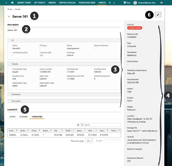 Click a CI in the list to see its details page. CI Form is a detail view of CI and contain Description and all default and custom properties.