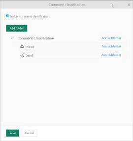 Inbox and Sent are default system folders and cannot be edited or deleted. To add new folder click Add folder button or select Add subfolder in menu rightmost on a row to define a new comment classification folder.