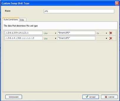 Example in Figure 3 shows a UPS unit type (uninterruptable power source), with Oid: .1.3.6.1.3.94.1.6.1.21.1 and value: *Smart-UPS*. Note that stars (*) i.e. wildcard, is always used with operator LIKE.