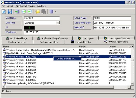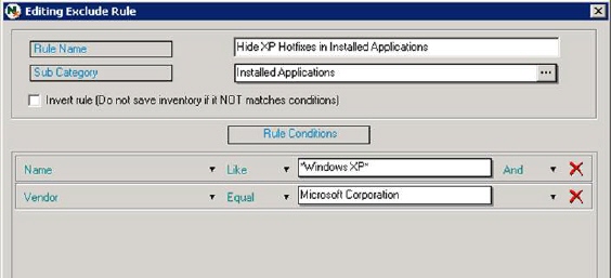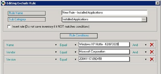 Here we for example will create a rule which will exclude Windows XP updates, hotfixes etc (since better info regarding windows update is already available in section Software Inventory, plus from a license perspective this information is not useful).