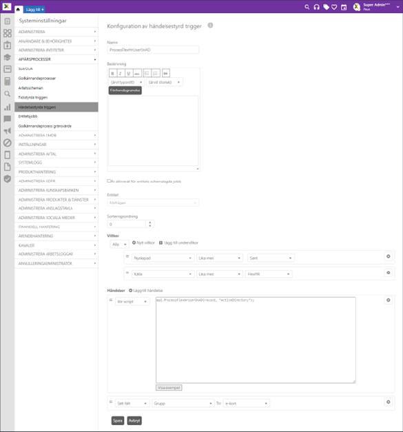 In order for the trigger to work you will also add an event which will run the script api.ProcessFlexHrUserOnAD(record, “ActiveDirectory”);