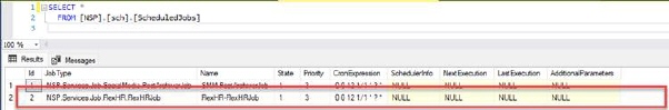 Within the [sch].[ScheduledJobs] table, there is an entry named 'FlexHR-FlexHRJob' under the job type. This job is configured to execute repeatedly based on the CronExpression value (e.g., every 2 minutes). The primary purpose of this job is to invoke the FlexHRJob service within the NSP environment at specified intervals.