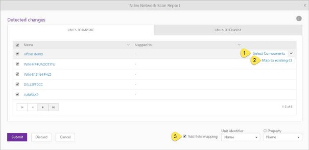 This form is divided in two tabs. First tab UNITS TO IMOPRT lists all changes detected by scanning NNS database. You can select which CIs you want to import by checking or unchecking checkbox on left side of CI name. Also you can click on button Select Components (1), and choose which CI components you want to import.
