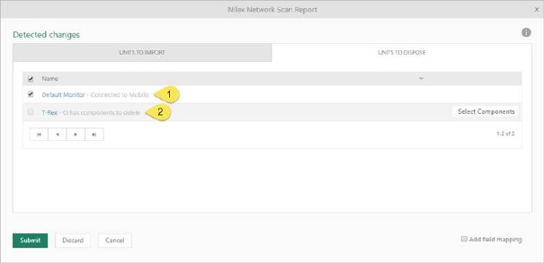 Second tab UNITS TO DISPOSE lists all changes between previously and current NNS scanning. e.g. If you have printer in NSP database which is imported from NNS database, and in meanwhile that printer is disconnected from the network. CMDB Integration will compare NNS database with all units in NSP which are previously imported from NNS and create lists of changes.