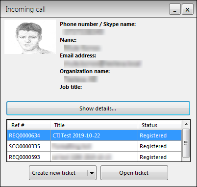 On the notification you can see Caller image, Phone number/Skype name, Name, and Email address. Below there is a list of existing tickets where the caller is Requester.
