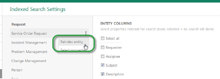 In Agent Portal> Configuration> Settings> Indexed search settings the administrator decide in what Entity properties the search should be done. After that, the first indexation must be done. For each Entity where you have marked columns, choose the drop-down menu Reindex entity.