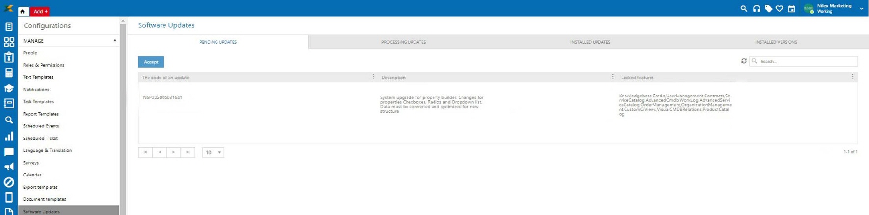 By clicking on the Accept button, the installation of the specified update is accepted and this update passes to the next status - processing updates. If the update is not accepted, the Locked features column will show which function will not be available due to the uninstalled update.
