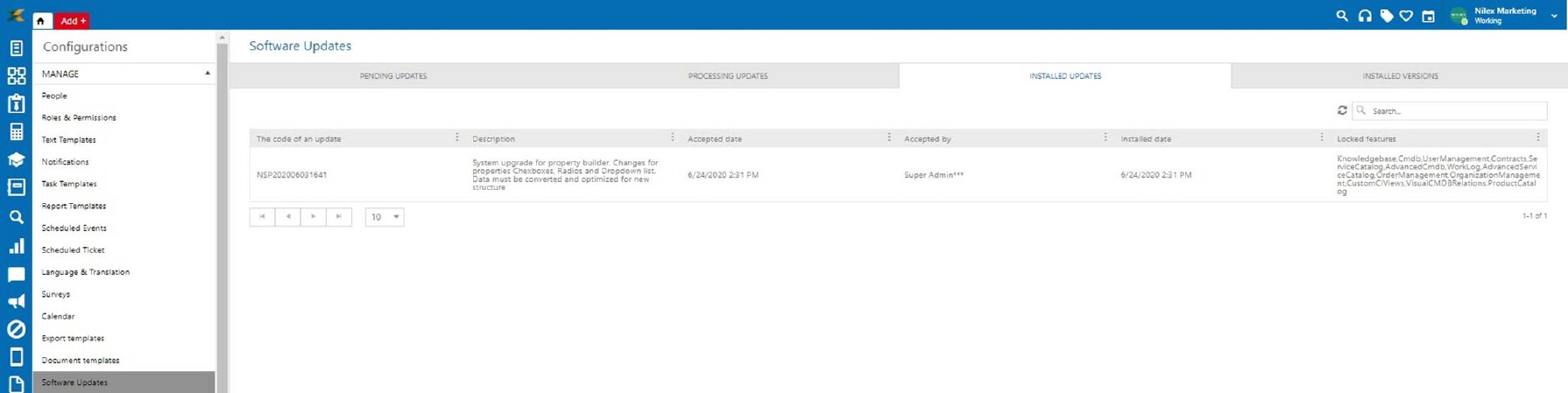 Most often, after starting the installation of a new version, all updates are installed automatically. However, there are certain cases when a specific update needs to be accepted manually in order to be installed in the system. The list of updates that need to be manually accepted can be found in the Pending updates tab, as shown in the picture below: