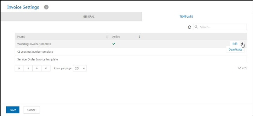 In order to be able to send invoices via email and download directly from the system, it is necessary to define a template how the invoices will look like. Clicking on the tab Templates in the Invoice settings, opens a list for setting up three templates, depending on the type of invoice. The system will automatically recognize the invoice type and assign it to a predefined template. By clicking the button Edit opens a popup for editing the template.