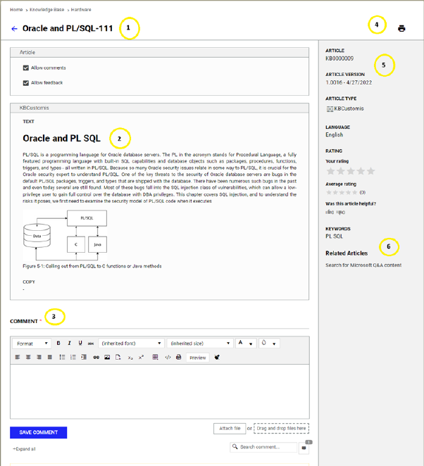 •Left panel: Shows specific Article properties (2), depending on Article type and comment form (3). All comments can be seen below the form.